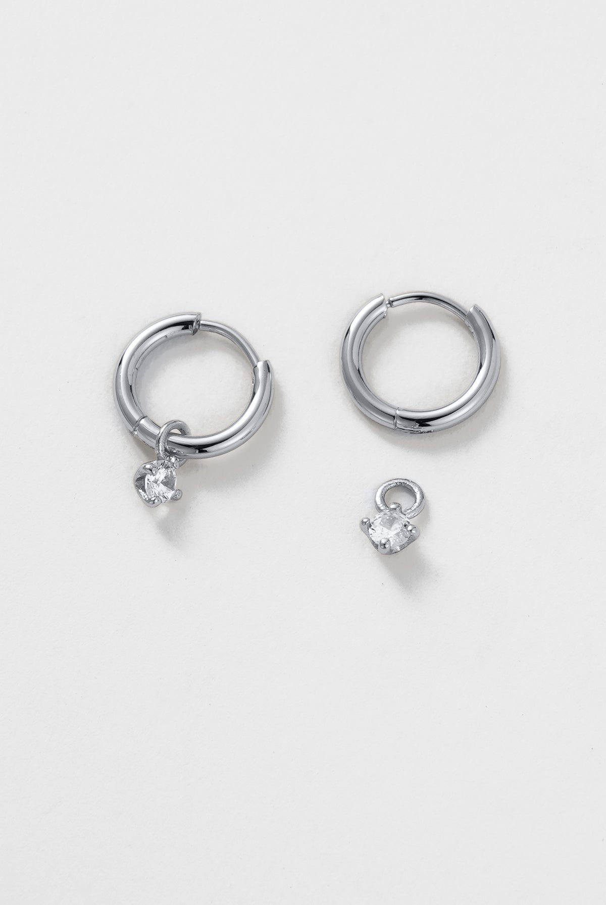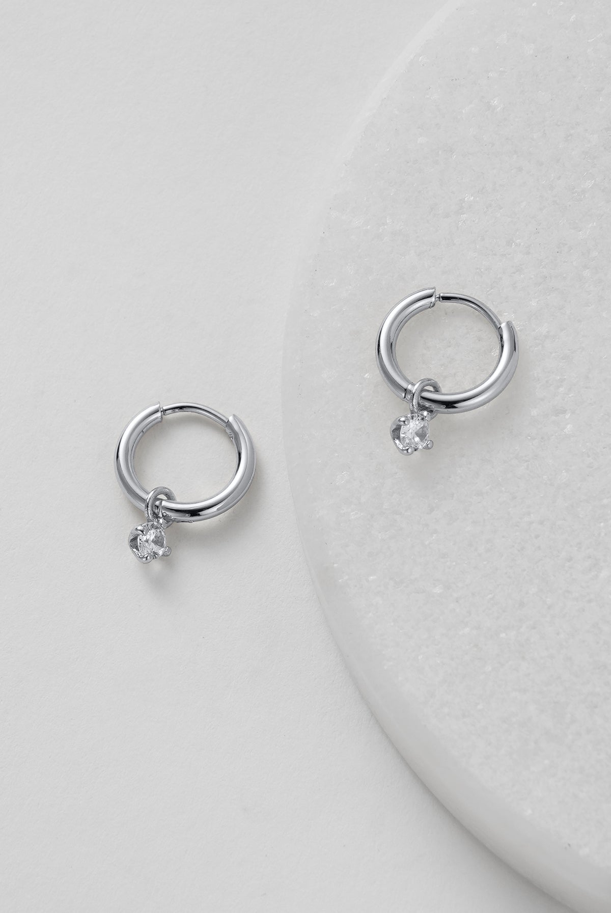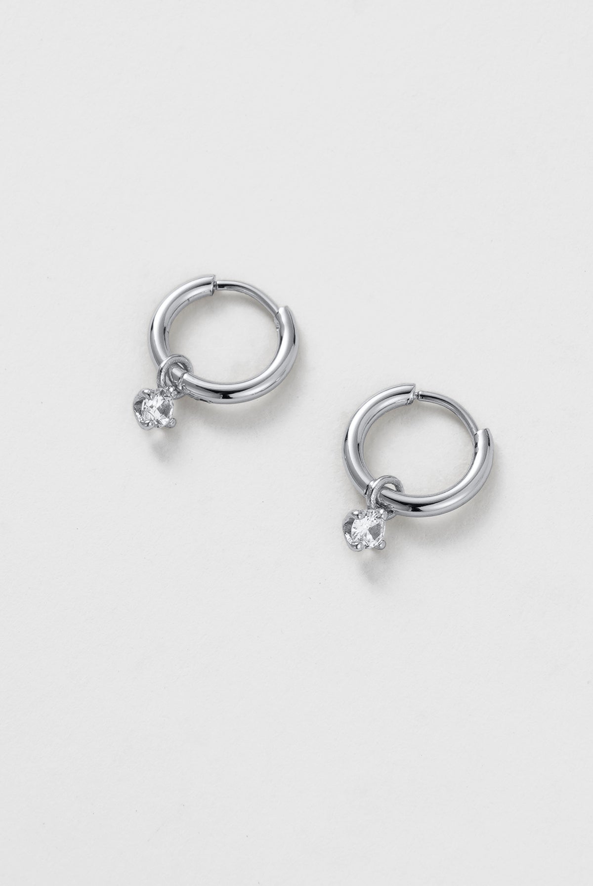 The Leila Earring is a delicate huggie hoop featuring a tiny crystal drop that adds a subtle touch of sparkle.